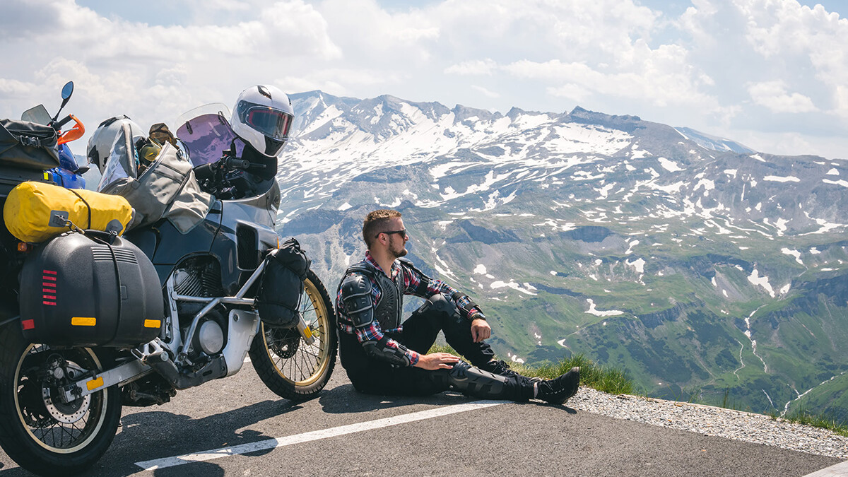• Unterwegs auf 2 Rädern. Gut gefüllte Satteltaschen auf der Maschine. Benzin im Tank. Mehr braucht es nicht. Im Frieden mit der Welt .